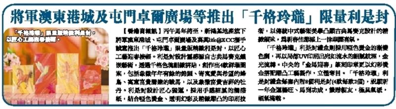 將軍澳東港城及屯門卓爾廣場等推出「千格玲瓏」限量利是封