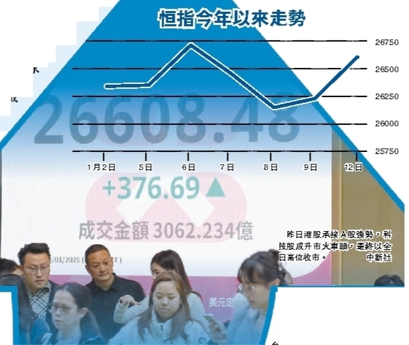 【香港商報訊】記者黃兆琦報道:昨日,A股AI應用板塊「集體暴動」,帶動港股一眾科技股乃至恒指造好。恒指當日升376點或1.44%,並以高位26608點收市;主板成交達3062億元,為自去年11月底以來再次突破3000億大關,北水淨流入逾73億元。其中,AI概念股大爆發,半新股智譜(2513)與MiniMax(100)分別升逾三成和一成半。有分析員預期,港股或見新一輪中期升浪。