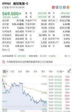 受此消息影響,攜程集團-S(09961.HK)股價當日承壓,至尾盤股價跌幅擴大,最終收跌6.49%,報569.5港元,總市值3722.27億港元。美股方面,攜程網(TCOM.US)美股盤前持續走低,截至發稿,跌超9%。