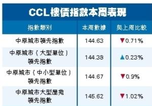 中原城市大型屋苑領先指數(CCL Mass)報145.62點,按周跌1.02%。CCL(中小型單位)報144.67點,按周跌0.9%。CCL Mass及CCL(中小型單位)齊終止兩周連升。CCL(大型單位)報144.38點,按周升0.23%。