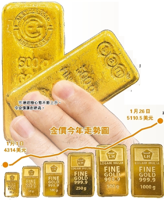 【香港商報訊】記者郭志文報道:由於地綠局勢持續升溫,加上美國又傳出再陷停擺,市場資金避險需求昨天又顯著上升、進一步推動貴金屬價格創新高。現貨金價26日突破每盎司5100美元關口,高見5110.5美元,再創歷史新高,不足一個月累漲超過18%。