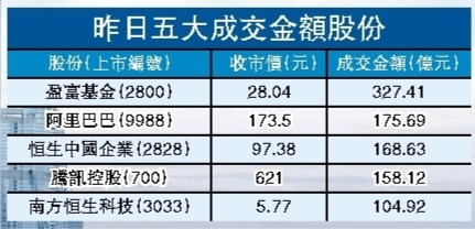 成交榜上,盈富基金(2800)交投最多,收報28元,升2.63%,成交金額多達327.4億元;其次是阿里巴巴(9988)升2.1%,報173.5元,成交額175.6億元;第三位是恒生中國ETF(2828),成交額168億元;騰訊(700)居第四位,升2.3%,報621元。