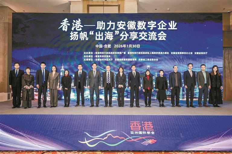 【香港商報訊】記者柏永報道:1月30日,「香港—助力安徽數字企業揚帆『出海』分享交流會」在合肥舉辦。活動匯聚皖港兩地政府部門、金融機構及數字企業代表160餘人,圍繞香港平台優勢與安徽科創實力的深度融合展開交流,此舉旨在為安徽數字企業國際化發展搭建橋樑,也為皖港數字經濟合作開闢新路徑。