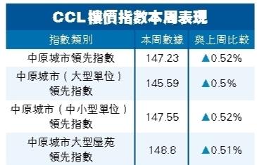 中原城市大型屋苑領先指數(CCL Mass)報148.80點,按周升0.51%。CCL(中小型單位)報147.55點,按周升0.52%。CCL Mass及CCL(中小型單位)齊升3周,分別累升2.18%及1.99%。CCL(大型單位)報145.59點,按周升0.5%。