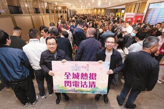 Sierra Sea 2B期昨日壓軸一輪銷售218伙,銷售現場人山人海,十分熱鬧。圖左為新地副董事總經理雷霆。