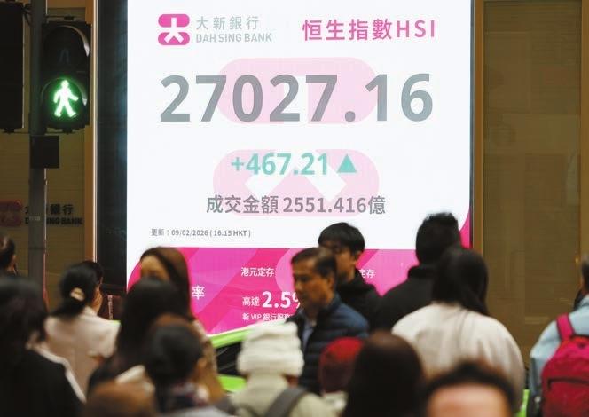 【香港商報訊】記者宋小茜報道:受內地及外圍股市造好影響,港股昨日承接外圍強勢,在科技股和金融股帶動下高開高走,恒指昨最多曾升551點,收升467點報27027點,企穩27000點關口,大市成交2551.42億元;國企指數9168點,升136點;恒生科技指數5417點,升71點。有分析認為,農曆假前港股料於27000點水平爭持。