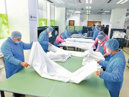 香港聖公會福利協會康恩園2022年起與國泰集團旗下的雅潔洗衣合作,幫國泰查檢、摺疊、包裝頭等倉用過的羽絨被。記者 馮瀚文攝