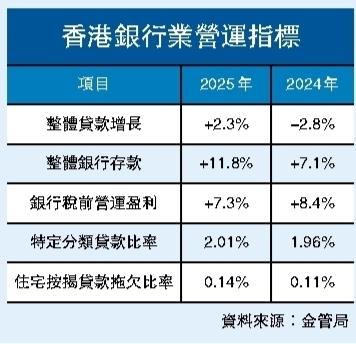 另外,香港銀行信貸質素方面,金管局數字顯示,雖然與內地相關的特定分類貸款比率由2024年的2.37%降至2025年的1.94%,但整體的特定分類貸款比率則由2024年的1.96%升至2025年的2.01%。