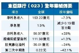 【香港商報訊】記者鄺偉軒報道:受累內地聯營信託公司錄得應佔虧損3.05億元、投資物業減值7.23億元以及56.42億元金融工具減值損失,東亞銀行(023)截至去年12月底止,全年純利按年減少24%至35.01億元,派第二次中期息每股0.22元,按年跌42%,可以股代息。
