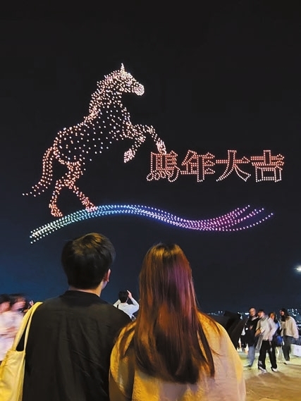 由紫荊文化集團主辦的「駿馬迎春.紫荊賀歲」大型無人機表演昨晚在灣仔海濱登場,以「馬」為紐帶,共祝國家和香港繁榮昌盛,吸引大批市民觀賞。