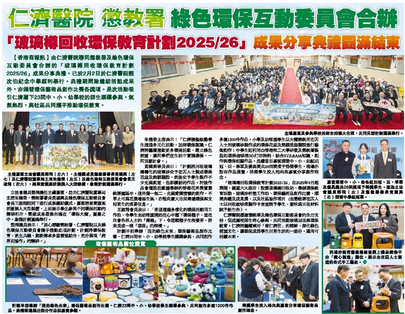仁濟醫院懲教署綠色環保互動委員會合辦「玻璃樽回收環保教育計劃2025/26」成果分享典禮圓滿結束