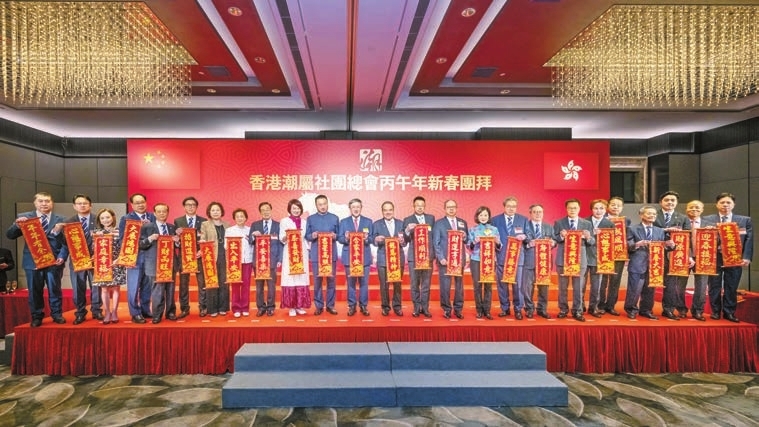 【香港商報訊】記者霄虹報道:香港潮屬社團總會2026丙午馬年新春團拜, 昨天於JW萬豪酒店舉行。政務司副司長卓永興,立法會主席李慧琼,行政會議召集人葉劉淑儀,民政及青年事務局副局長梁宏正,中聯辦社團聯絡部副部長胡啓明、港島工作部副部長楊成偉、九龍工作部副部長郭長勇、新界工作部副部長朱宜華,民政事務總署署長杜潔麗等出席主禮,與一眾政府官員,中聯辦領導,本港潮屬社團首長、嘉賓及會員,新聞界朋友等歡聚一堂,同賀丙午馬年新春,場面溫馨又熱鬧。