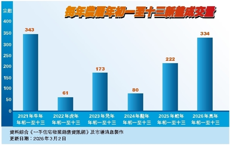 【香港商報訊】記者韓商報道:美聯集團行政總裁(住宅)暨香港置業行政總裁馬泰陽指出,馬年新盤「一馬當先」,據該行研究中心綜合《一手住宅物業銷售資訊網》資料及市場消息,馬年大年初一至十三(2月17日至3月1日),香港住宅新盤成交量錄得約334宗,遠勝蛇年同期(2025年1月29日至2月10日)的222宗,按年大幅上升約50.5%,並創5年同期新高。