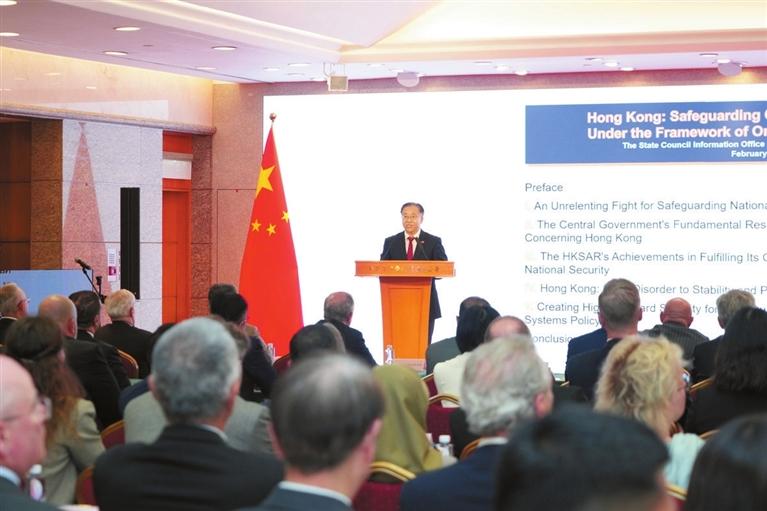 崔特派員在宣講中全面介紹了白皮書主要內容和重要意義,回顧了香港回歸以來維護國家安全的主要鬥爭,闡明了中央政府對香港有關國家安全事務所負根本責任、香港特區履行維護國家安全的憲制責任,宣介了香港從由亂到治走向由治及興在良政善治、司法法治、經濟發展等方面取得的成就,並分享了「一國兩制」下香港維護國家安全的實踐經驗。