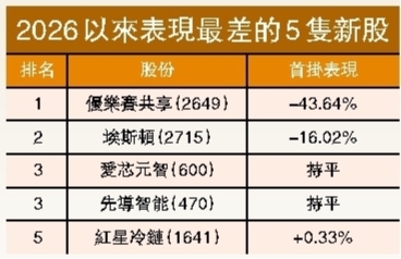 翻查資料,今年以來表現最差的新股,依次為優樂賽共享、埃斯頓(2715)、同為首掛表現持平的愛芯元智(600)和先導智能(470),以及首掛微升不足1%的紅星冷鏈(1641)。