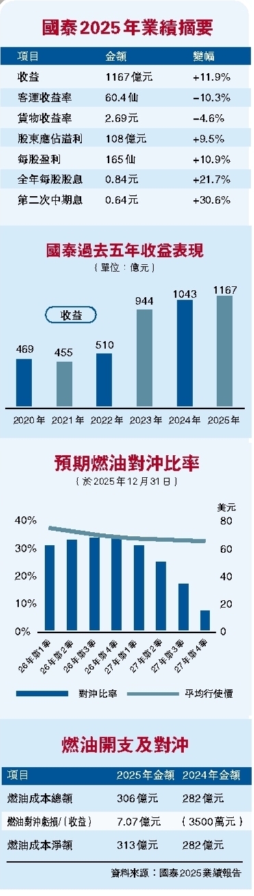 【香港商報訊】記者鄺偉軒報道:國泰航空(293)昨日公布2025年全年業績,收益達1167.7億元按年增12%,純利至108.3億元按年增9.5%,派第二次中期息每股0.64元,按年增長30.6%。就近日中東局勢對燃油成本帶來的波動,國泰表示,將很快宣布上調燃油附加費;並指來往香港和歐洲以及來往印度及北美的客運航線近日需求見有上升,期望中東危機可盡快解決。