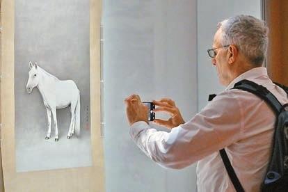 香港故宮文化博物館「天馬凌雲——故宮博物院藏繪畫珍品」專題展覽今起開放予公眾參觀。圖為一名外籍人士拍攝清朝道光皇帝之孫、愛新覺羅.載瀛的《畫馬圖》。中新社
