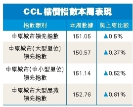 目前,CCL距離第二季目標156點(即2023年通關前的低位),只相差4.95點或3.28%。分類指數方面,中原城市大型屋苑領先指數(CCL Mass)報152.76點,按周升0.61%。中小型單位領先指數報151.14點,按周升0.52%。大型單位領先指數報150.57點,按周升0.37%,連升兩周共0.65%,