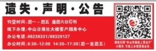 ■李建辉遗失《墓地使用证》1本,墓区、行数、位数为:福康一区17行43位,特此声明。 ■李盛开遗失《墓地使用证》1本,墓区、行数、位数为:福康一区8行37位,特此声明。
