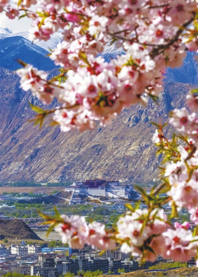 桃花映衬着布达拉宫(4月17日摄)。近日,西藏拉萨市城关区慈觉林社区的一片古桃树进入盛花期,因其正对着布达拉宫,成为游人拍照打卡的“网红”地。