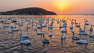 11月29日,在山东省荣成市俚岛镇烟墩角村,大天鹅在水中栖息觅食(无人机照片)。