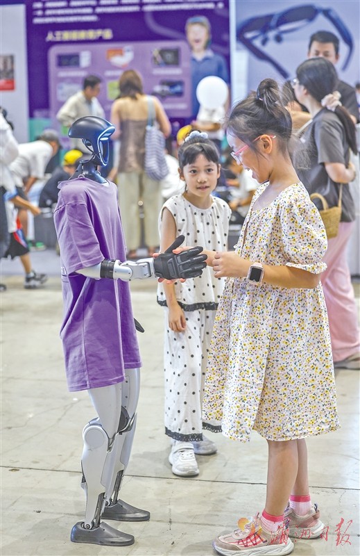 8月17日,在青少年科技嘉年华上,宇树科技机器人跟孩子们互动。
