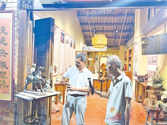 20时20分,位于县巷155号的非物质文化遗产“陈氏工艺雕塑”陈春晖塑像馆前,一名60余岁的老汉正手持新潮小巧的云台摄像机拍摄陈春晖正在创作的“状元红”雕塑。市级非物质文化遗产“陈氏工艺雕塑”代表性传承人陈春晖正向观众介绍此作品:“莆田‘状元文化’底蕴深厚。北宋熙宁九年(1076年),莆田考生徐铎高中文状元,薛奕夺得武状元,创造了中国科举史上唯一同年同地区考生考中文武双状元的奇迹。此后,两家联姻,徐铎以家乡特产‘延寿红’荔枝为聘礼。后人将此荔枝品种改名‘状元红’。”至今莆田绶溪畔古荔“状元红”依然枝繁叶茂。该作品反映的就是这个故事。??