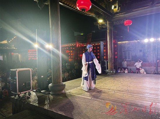 19时40分,一阵锵然骤起的板鼓声从不远处传来。记者循声来到位于大路街的市级文物保护单位“崇功祠”,适逢周日,兴化府历史文化街区的固定节目“周末戏相逢”正在精彩上演,观众围了里三层外三层,纷纷举着手机拍照。当晚演出的是莆仙戏传统剧目《彦明嫂出路》,由福建省莆仙戏剧院公益演出。见身旁一名20余岁、衣着时尚的女郎正伴着戏曲中的鼓点,轻轻打着节拍,记者好奇地问:“小姑娘怎么会喜欢莆仙戏?”女郎看了记者一眼说:“我是莆田学院学生,我们班上好多同学都喜欢莆仙戏。莆仙戏可是‘宋元南戏活化石’,莆田的骄傲!”“你不知道吧,这出戏不同于多数才子佳人戏,是莆仙戏中罕见以寡妇为主角的反抗封建礼教题材,堪称莆仙戏中的‘祥林嫂’。”