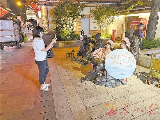 19时25分,庙前街林扬祖故居前,一对身着宋朝服饰的小姐妹手撑纸伞分立“陈经邦与补鞋匠”铜雕左右,一名白衣女子正为这对可爱的女儿打卡留影。白衣女子姓唐,两个女儿分别上三年级和上一年级。她笑称,受自己的影响,2个孩子打小就痴迷宋韵文化,快开学了,还不顾天气炎热,“盛装”来体验街区的传统文化氛围。