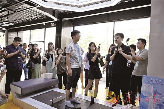 在双驰定制工厂,采访团体验“量脚定制”流程(如图)。每日经济新闻记者朱成祥说,“中国鞋都”莆田名不虚传,个性化定制非常符合消费精细化需求,有助于提升市场竞争力。