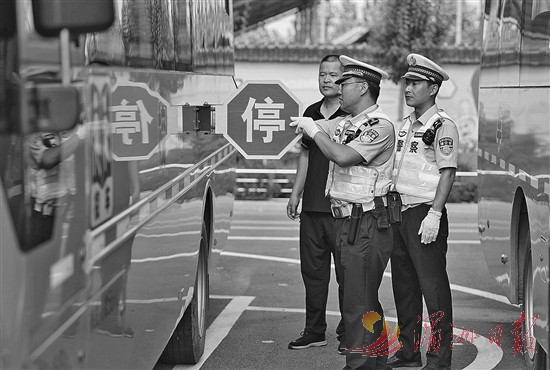 8月22日,在山东省临沂市沂南县铜井镇中心小学,沂南县公安局交通管理大队民警在检查校车。新学期开学临近,多地开展校车安全专项检查,及时排除隐患,确保学生乘车安全。新华社 发