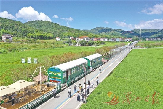 8月中旬,记者来到南兴村,一股田园气息扑面而来。一条红、黄、蓝三色交织而成的标线向前延伸,融入“1314”“520”“遇见你遇见爱”等浪漫元素。这条彩虹路全长3.2公里,环绕村庄。村口一辆“乡村振兴号”的绿皮小火车十分醒目,该村与仙溪茶叶携手打造具有钟山文化特色的奶茶产品,吸引了不少年轻人打卡品尝。
