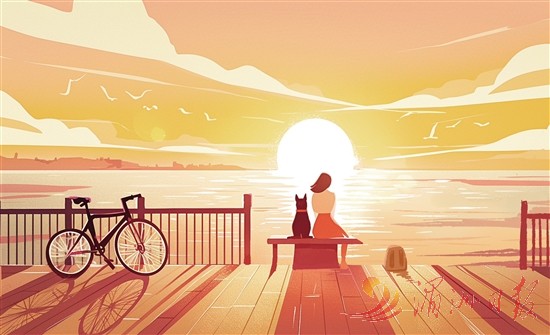 这时,街道上的车辆多了起来,隐约传来叫卖声,为这座小岛注入了生机与活力。海天一色,只能看见夺目的亮光。发亮的也不再是太阳、云朵、大海了,整座岛都披上了华丽的红装,红的人,红的树,红的沙滩……世间万物都被太阳涂成了红色,而那云朵则变成了五颜六色的绸缎,大海成了一幅五光十色的图画……