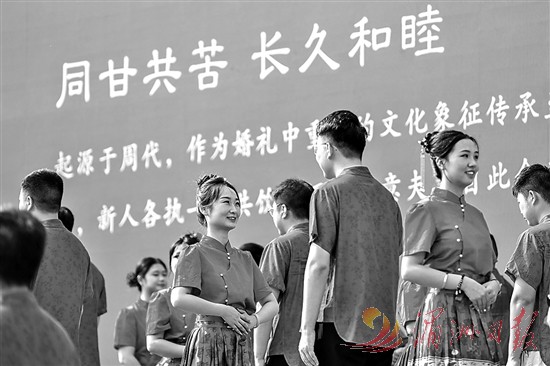 8月30日,湖南省第十届国潮集体婚礼在常德河街春秋广场举行,77对新人身着简约中式婚服,与家属代表共同见证这一幸福时刻。本次活动旨在通过融合传统婚俗与国潮元素,倡导“婚事新办简办”的文明新风,引导广大青年树立健康、文明、节俭的婚恋观,为新人留下了难忘的浪漫记忆。 新华社记者 陈思汗 摄