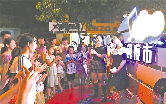 为打造丰富多元的夜间消费场景,推动消费需求更好释放,天桥美食夜市还引进“林旺演艺”的歌手驻唱。每周三晚7点半到10点现场献唱,歌声与烟火撞个满怀,让夜市街头变身露天音乐场。其间,还穿插互动游戏、猜歌名、接歌词等,参与的顾客有机会赢取夜市摊位专属优惠券当晚消费。驻唱歌手江钰焓今年6月刚毕业于莆田学院音乐学院,是团队负责人之一。她说:“目前我们团队共有20多人,安排轮流驻唱。因为夜市听歌的主要是年轻人,所以我们主要以流行歌曲为主,也会安排乐器演奏等,满足不同需求。‘美食+音乐’的创意组合,也为夜市吸引更多的人流量。”