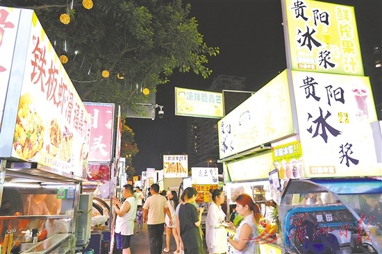 笔者在现场看到,冰糖葫芦、铁板鱿鱼、新疆羊肉串、爆汁生蚝、水果冷饮……172个摊位的美食琳琅满目、应有尽有,成为吃货的天堂。家住附近的林女士表示,这个夜市菜品多样、安全卫生,还有管理人员现场维持秩序,已成为网红打卡点,她经常会带闺蜜来这里逛,体验感很好。