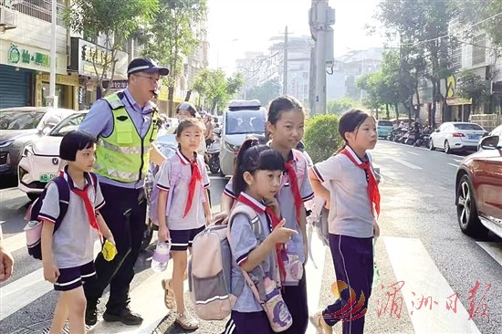 本报讯 9月1日开学首日,荔城区第一实验小学校门口车水马龙。拱辰街道办事处开启“护学模式”,组建由派出所、交警、城管中队及联防队“四位一体”的护学岗队伍。