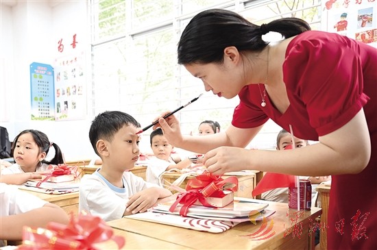 一早迈入校园,孩子们走过写着浓浓祝福语的“红毯路”。高年级的学长们用学校特色的车鼓队表演,迎接学弟、学妹们的到来。在老师的耐心引导下,新生们初步熟悉课堂常规、文明礼仪、整理书包等日常习惯要领。行礼拜师、击鼓明志、朱砂启智……在家长见证下,孩子们参加了入学仪式,憧憬着校园美好生活。