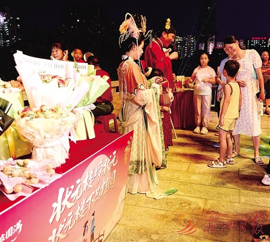 8月29日七夕夜,绶溪公园状元阁上空,数百架无人机列阵而起,“状元帽”“鹊桥相会”“妈祖故里”等15组极具莆田辨识度的图案在夜空次第绽放。传统故事被科技重新编码,引得万人仰望。地面上,“魁星点额”“织女对诗”“祈愿树系红绳”等活动同步上演,龙眼市集也格外引人注目。这个夜晚,舌尖与心尖一起被点亮。
