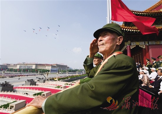 天安门西侧观礼台上,白发苍苍的抗战老兵刘世钺凝望着蓝天上如长虹般的彩烟带说:“真想让牺牲的战友看看,咱们今天的队伍、武器、飞机。真想让死去的同胞知道,再没有人能欺负咱。”