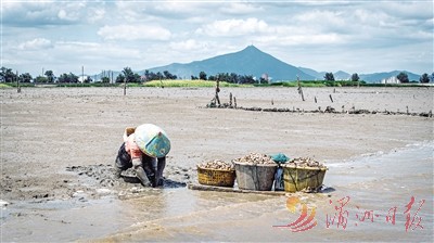 初秋时节,劳动者在木兰溪入海口滩涂赶海挖蛏。