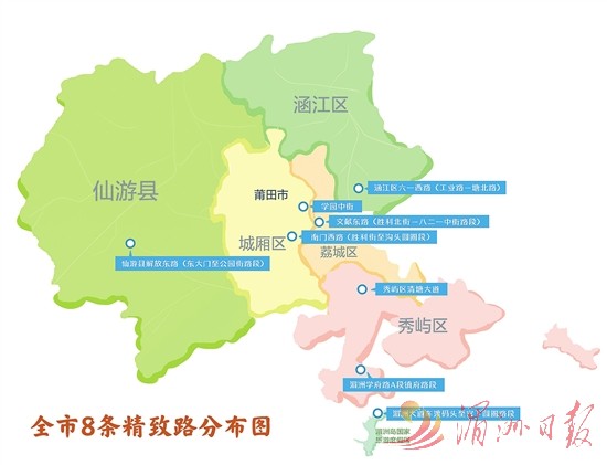昨日,记者从市城市管理局了解到,8条精致路分布在全市各县区,采取“一街一策、精益求精”“整洁有序、舒适友好”方案实施建设,重点提升道路功能、完善服务设施、合理布局街道设施、改善人行空间、顺畅交通、绿化景观,彰显莆田文化特色。