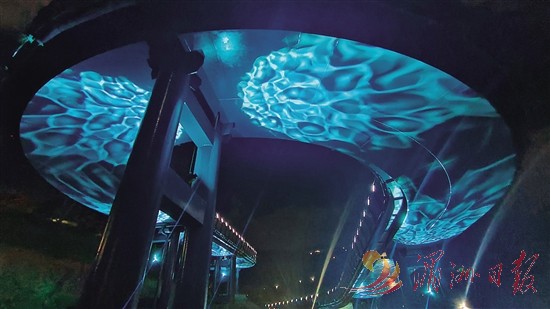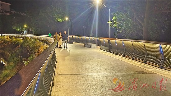 昨晚6时45分,莆阳福道天马广场,架空栈桥灯光依次亮起。桥身下投射的流动蓝色波纹光影,其动感光效让山林步道瞬间化作“滨海长廊”,为夜游市民营造出“山林观海”的独特体验。