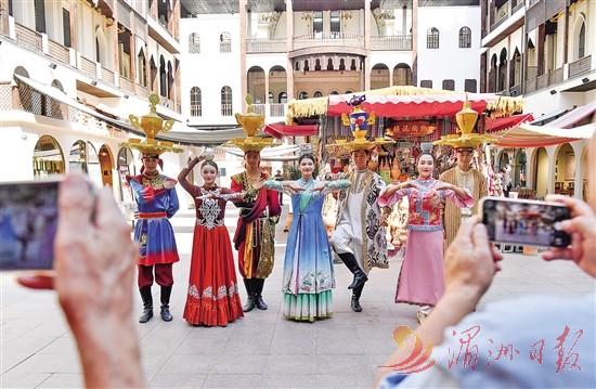 9月9日,在位于新疆乌鲁木齐的大巴扎步行街疆来城,演员在表演萨玛瓦尔舞。萨玛瓦尔舞起源于新疆库车,出现在公元4至7世纪龟兹乐舞鼎盛时期,在克孜尔千佛洞窟内可找到与萨玛瓦尔舞类似的壁画场景。2007年,萨玛瓦尔舞被列入新疆维吾尔自治区级非物质文化遗产名录。新华社记者 王菲 摄