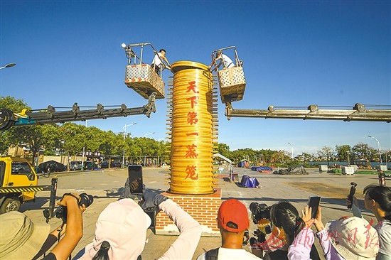 据悉,忠门蒸笼亦称卷炊、灶炊,始见于明代嘉靖年间,迄今已有430余年的历史。忠门蒸笼选材讲究,选用富有弹性的柳杉、甘母木、鸭掌木配以柔韧性好的竹片和山藤等材料,经过30多道工序精心加工制作而成。“天下第一蒸笼”由莆田市级非遗“忠门蒸笼制作技艺”代表性传承人黄进泉和技师们历时20天制作完成。