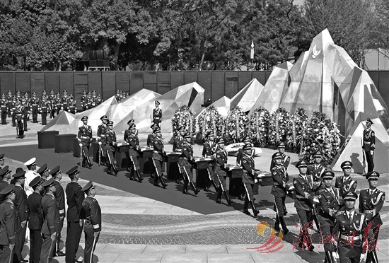 松柏无声,草木含悲。礼兵抬起志愿军烈士棺椁绕广场半周,缓缓走向安葬地宫。全场人员排起长队,向烈士献花致敬,并瞻仰烈士英名墙。