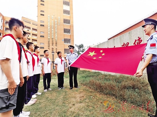 新学期开学,莆田出入境边防检查站走进莆田第五中学附属学校,开展专业升旗手培训。图为移民管理警察为学生示范升旗礼仪,为青少年上了一堂生动的爱国主义教育课。吴志 摄