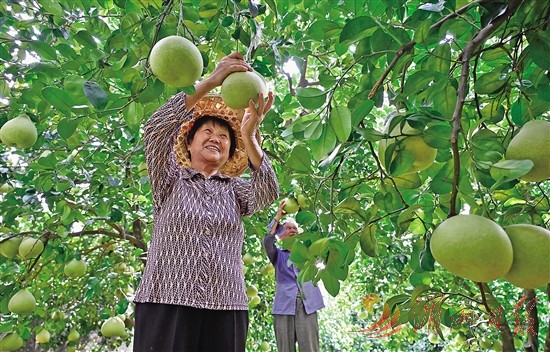 金秋时节,仙游县度尾镇文旦柚迎来采摘季。图为果农在果园里忙碌采摘挂满枝头的文旦柚,现场呈现出一派丰收的喜悦景象。