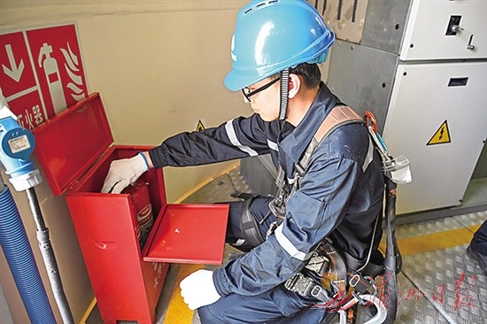 在10号风机塔底,张辉熟练地打开门禁,谢光煌则开始例行检查,仔细查看设备状态及运行参数。“一切正常,将风机切换至就地模式并停机做好安全措施后,就可以登塔了。”谢光煌记录完毕后说道。“扣好安全绳,站上踏板,面朝支架,双手抓紧,开始登塔。”张辉一边说,一边按下按钮,免爬器缓缓上升,到达塔顶。谢光煌也利落地系上双钩安全带登塔,他说,虽然自己从小生活在山里,擅长爬山,但要爬上这么高的机舱,还得靠勇气。