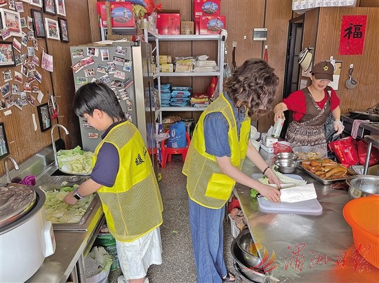 “今天是周六,领餐的人比平时多,洗菜可不能马虎。”当天,“90后”埭头籍义工林碧霞让10岁的儿子王子弋将大白菜放在水龙头下,用流动的水洗干净。在长条桌的另一头,家住城厢区霞林街道六部桥的“85后”义工李香珊和“00后”儿子林望旭将餐盒摆好,挨个递给“90后”华亭籍义工黄阳花,每个餐盒装入1只鸡腿。